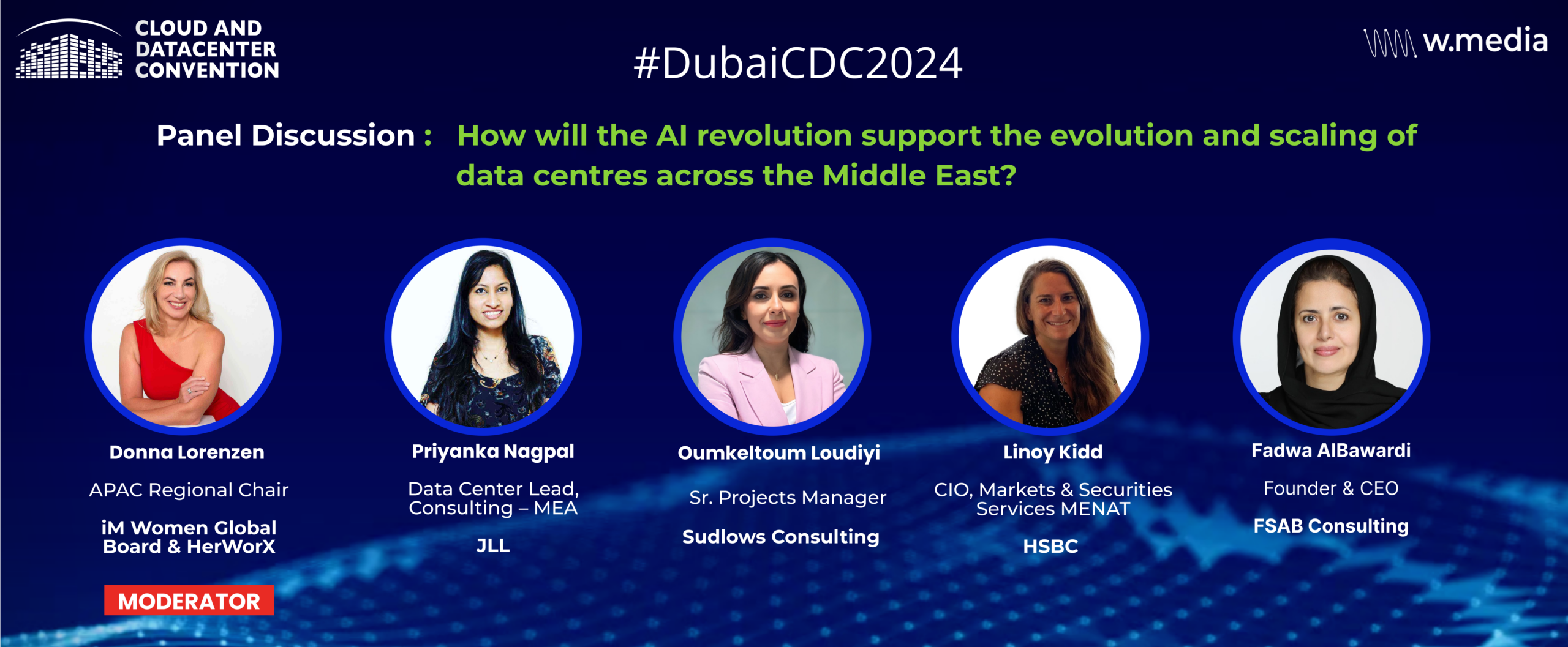 This year we also have a special all-woman panel where we are bringing together women professionals and pioneers from the technology industry discuss the impact of Artificial Intelligence on the rapidly evolving digital infrastructure landscape in the Middle East. Moderated by Donna Lorenzen (APAC Regional Chair and Global Board Member, iMWomen, and Founder HerWorX), the panel will include Priyanka Nagpal (Data Center Lead, Consulting – MEA, JLL), Oumkeltoum Loudiyi (Sr. Projects Manager, Sudlows Consulting), Linoy Kidd (CIO – Markets and Securities Services, MENAT, HSBC Bank Middle East), and Fadwa AlBawardi (Founder & CEO, FSAB Consulting).