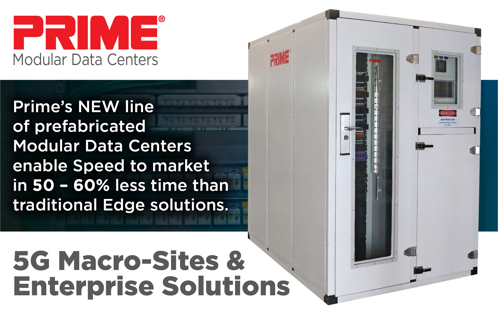 For its MDCs, Prime created economies of scale by utilising the same components and a limited amount of structures which enables speed to market in 50- 60 percent less time than traditional Edge solutions for 5G Macro-Sites or Enterprise environments.