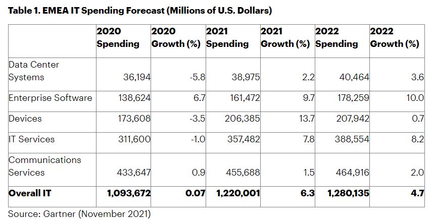 IT spending in EMEA is forecast to total $1.3 trillion in 2022, an increase of 4.7 per cent from 2021, according to the latest forecast by Gartner, Inc. The 2022 growth rate will be slower than in 2021 whereas the EMEA IT spending is expected to grow by 6.3 per cent.