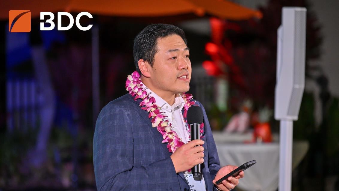 Drew Chen, Global Partner, Bain Capital, speaking at BDC’s refreshed brand identity launch event during the Pacific Telecommunications Council (PTC) 2026 conference in Honolulu, Hawaii. Credit: BDC