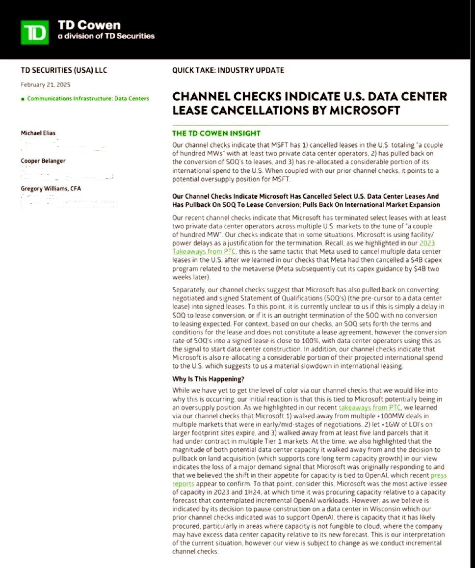 But last Friday, in an industry update TD Cowen said that their channel checks indicated that Microsoft had cancelled leases in the US to the tune of “a couple of hundred MWs” with at least two private data center operators. It further claimed that Microsoft had pulled back on converting negotiated Statement of Qualifications (SoQ) to leases, and had also re-allocated a considerable portion of its international spend to the US.